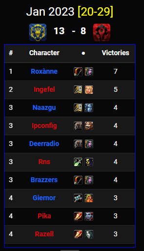 Congratulations to our January 2023 PvPstats winners! We have distributed 50 Chromie Points (CP) per victory in BG to the top 50 players of all brackets.