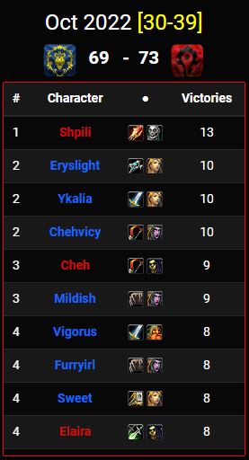 Felicitaciones a nuestros ganadores de las Estadísticas PvP de Octubre 2022! Hemos distribuido 50 Chromie Points (CP) por victoria en BG al top 50 de cada grupo.